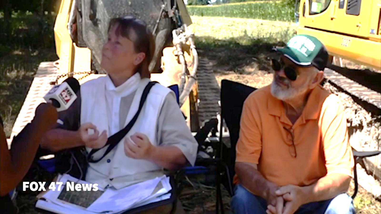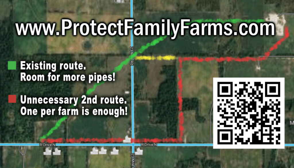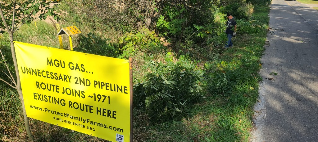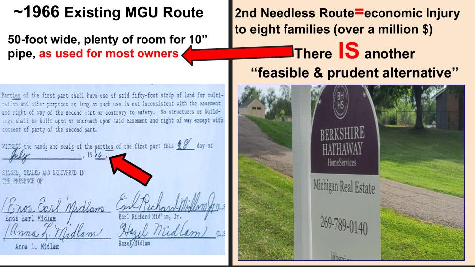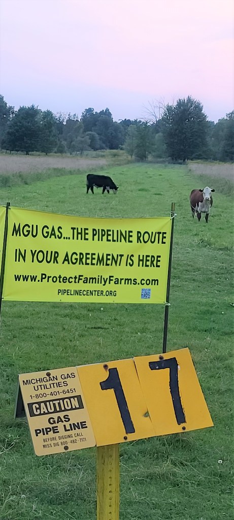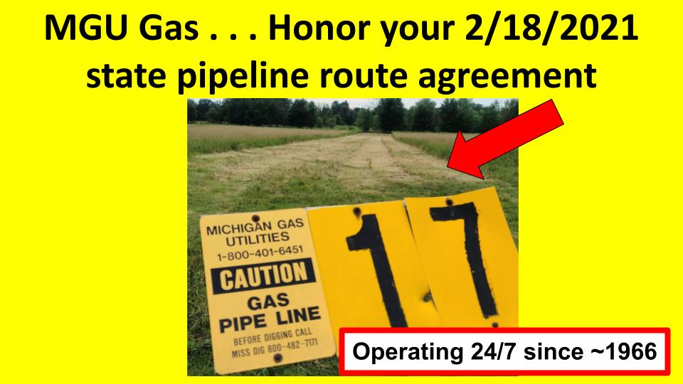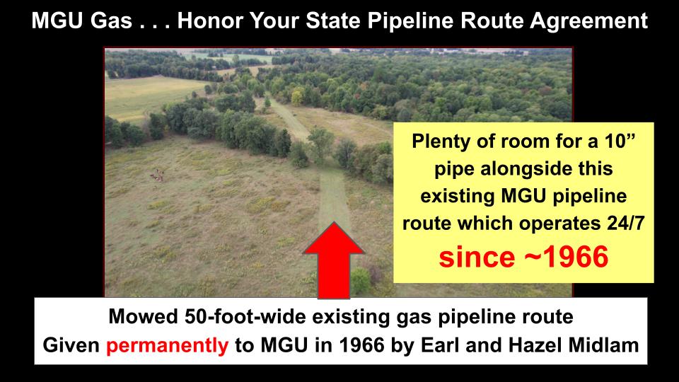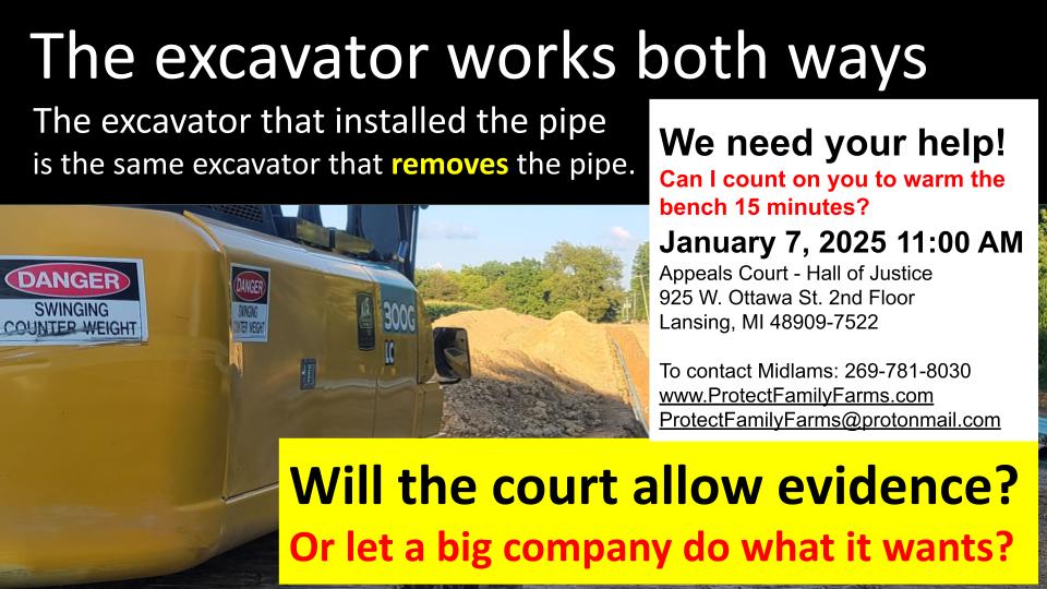 August 2, 2022 Lisa & Richard Midlam (third generation family-farm siblings) chained to Michigan Gas Utility Corporation (MGU) excavator after MGU razed their cornfield but wouldn’t return emails & calls to answer these questions (as requested by MPSC director): Why do you need a second, permanent gas-main-pipeline route on the same farm? Why is it “necessary” to take more land for a second, risky route after our parents permanently gave MGU their existing, safer pipeline route in 1966?
